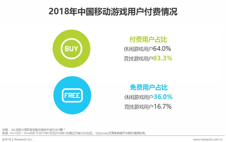 在用户付费行为方面,将国内休闲移动用户的整体付费率及玩家年均付费金额与竞技类游戏用户做直接对比后可以发现:休闲移动用户无论是在整体付费率还是在人均付费额度上的表现都要弱于竞技类移动游戏用户。休闲游戏由于整体游戏设计偏轻度,游戏中不会有太多且复杂的玩家间游戏数据的直接对比。因此,整体市场用户的消费意愿会更趋于理性。此外,与竞技类移动游戏相比,休闲移动游戏内的付费点及付费服务的投放量也会相对更少。正是在这样的市场背景之下,形成了整体休闲移动游戏市场付费用户及付费总金额相对较少的现状。