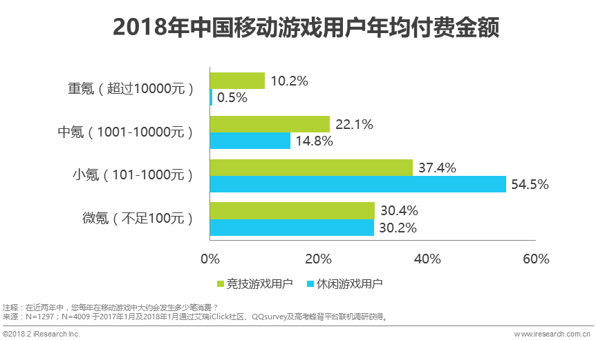 用户整体付费率与付费金额均低于竞技类移动游戏用户