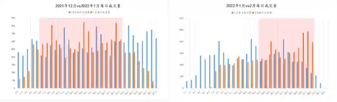 之前我们对1月、2月的日成交量进行的比对分析,发现12月-1月-2月,的主要工作日成交量竟然是依次递增的关系。