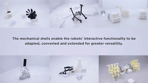套上壳之后,小方块就可以和外壳联动去完成各种任务。这些外壳不涉及任何电子设备,可以借助 3D 打印的方式制造出来。