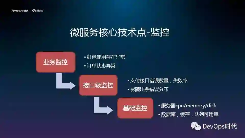 微服务还有很重要的核心技术点就是监控,微票儿有业务单元的监控,红包是否存在异常,是否有黄牛每天不断地在领红包,订单的状态是否一致,是否微信支付会有延长,是否微信支付的回调会有异常。然后还有接口级别的监控,每个接口的成功、错误率,调用的时间。通过业务、接口、基础监控和日志处理分析来监测服务是否异常。