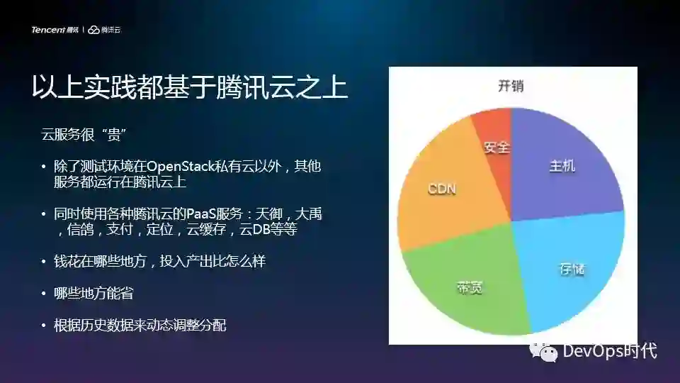 以上所有的Cloud Native实践,都是通过腾讯云来实现的。有人会说,你本身的虚机再铺一层会不会把资源浪费,可能会浪费,但是通过你整体的服务来讲,资源是在下降的,服用是在下降的,而且这里可以看到我们所有的资源开销的占比,看起来最贵的还是带宽,但是这一块就是因为我要有很多的调度系统去实现我的微服务调度和使用资源的调度,都会使用带宽,这一块的成本会增加,但是储存成本和主机成本都在下降。
