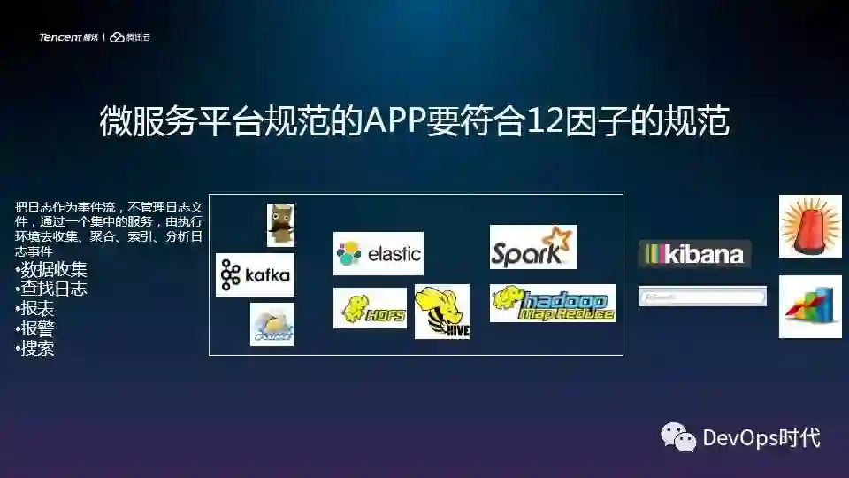 其次,日志作为统一的事件流,统一处理服务和进行收集、聚合、搜集、分析,每个程序的开发都要看到数据,他们每天要看所有的数据是否打算,自己的请求耗时大概是多少,自己的请求返回时间是多少,它吃的带宽是多少,都可以通过自己的数据和日志查找到相应的自己服务的相关报表,整个后面还有一系列的报警。