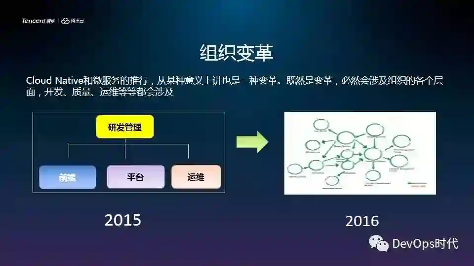为了解决这些问题,微票儿在做微服务的时候针对组织结构进行了变革,2015年研发管理就是前端、平台、运维,到了2016年变成了打散的方式。
