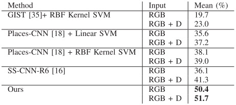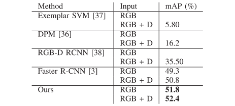 作者在SUN RGBD数据集中的19个对象类别的检测任务和19个场景类别的场景识别任务评估的提出的网络。