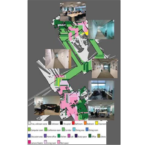 作者在真实室内环境建立语义地图,如下图所示,占用栅格地图中的空间由其对应的场景类别标注,例如走廊标记为绿色,起居室和办公室分别标记为粉红色和暗绿色。