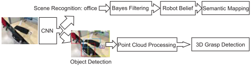 本系统主要有三个关键部分:一个用于场景理解和对象检测的多任务CNN;一个用于语义建图的置信度更新系统;一个将2D检测结果扩展到3D空间用于抓取的点云处理流程。