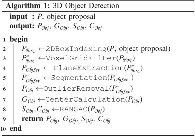 2D的检测结果不足以满足真实物理世界中的机器人应用。作者提出一个算法,接受网络的预测输出、Kinect V2的RGB图像和点云来检测对象的基本几何信息。算法如下所示: