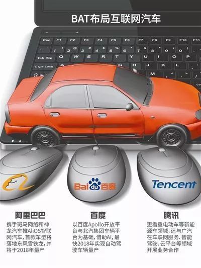 虽然美国科技公司,特别是谷歌母公司Alphabet和其旗下的无人驾驶汽车子公司Waymo也向汽车领域投入了巨额资金,但是因为外国网络公司很难在中国市场获得立足,BAT拥有着巨大的竞争优势。这也促使福特汽车、宝马、上汽集团、吉利等国内外汽车制造商纷纷与BAT建立伙伴关系。