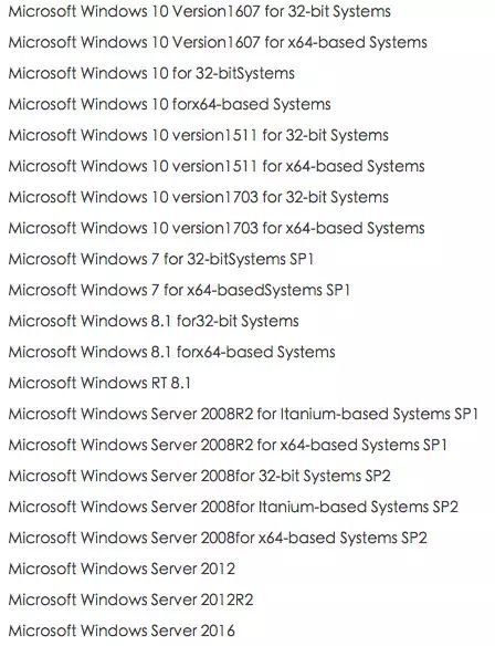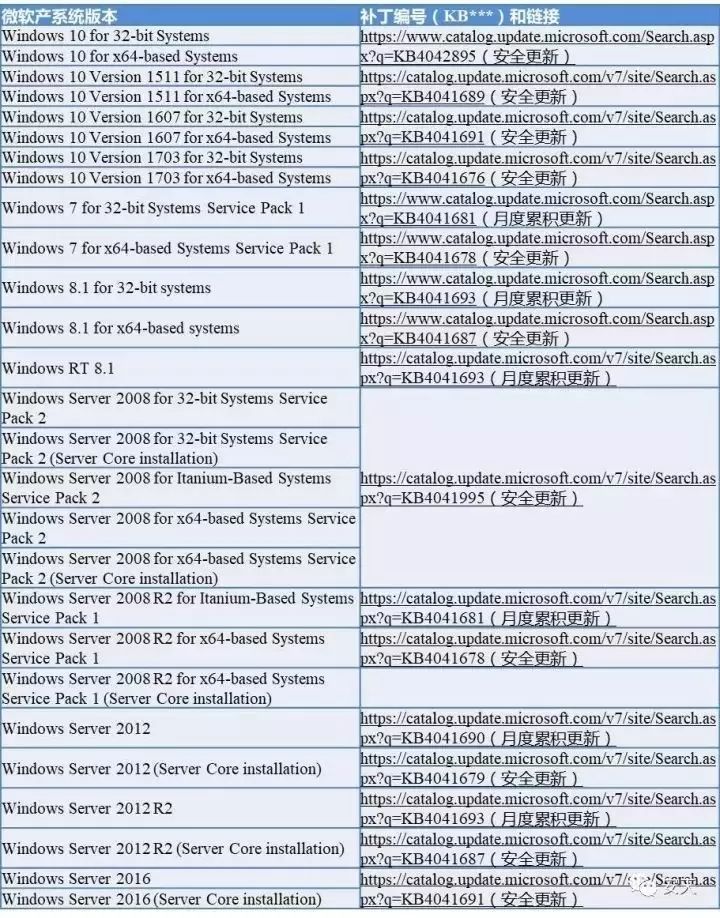 安天安全研究与应急处理中心(安天CERT)也整理了不同系统版本微软官方补丁编号及参考链接,如表所示: