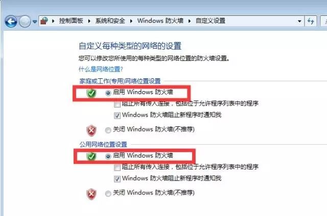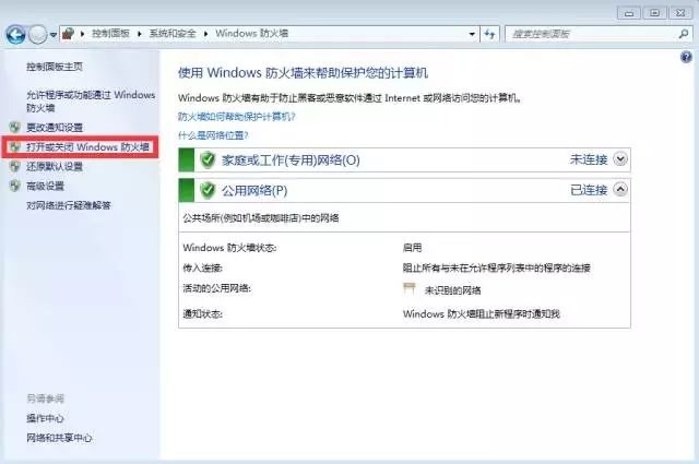 2、打开“控制面板→系统与安全→Windows防火墙”,点击左侧“启动或关闭Windows防火墙”。