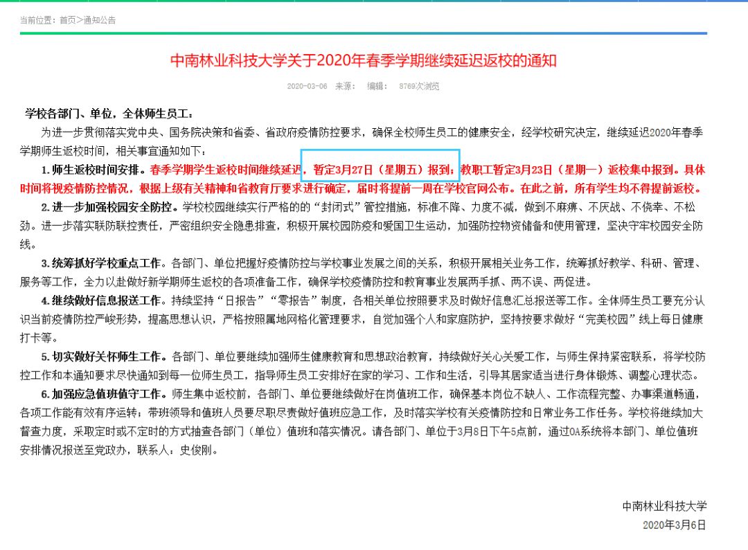 不过,目前全国大部分高校都未指定具体的学生返校时间点。而且软科(ID:zuihaodaxue)注意到,中南林业科技大学的此则通知发出的时间是在教育部发出“大学开学继续延后”的消息之前。那么,学校很可能会对开学时间做进一步调整。本来预定于下周五开学的中南林业科技大学是否能按期开学呢?按照其具体开学时间提前一周在官网公布的时间节点,如期开学与否在本周五就必须敲定。软科将持续关注此事的最新进展。