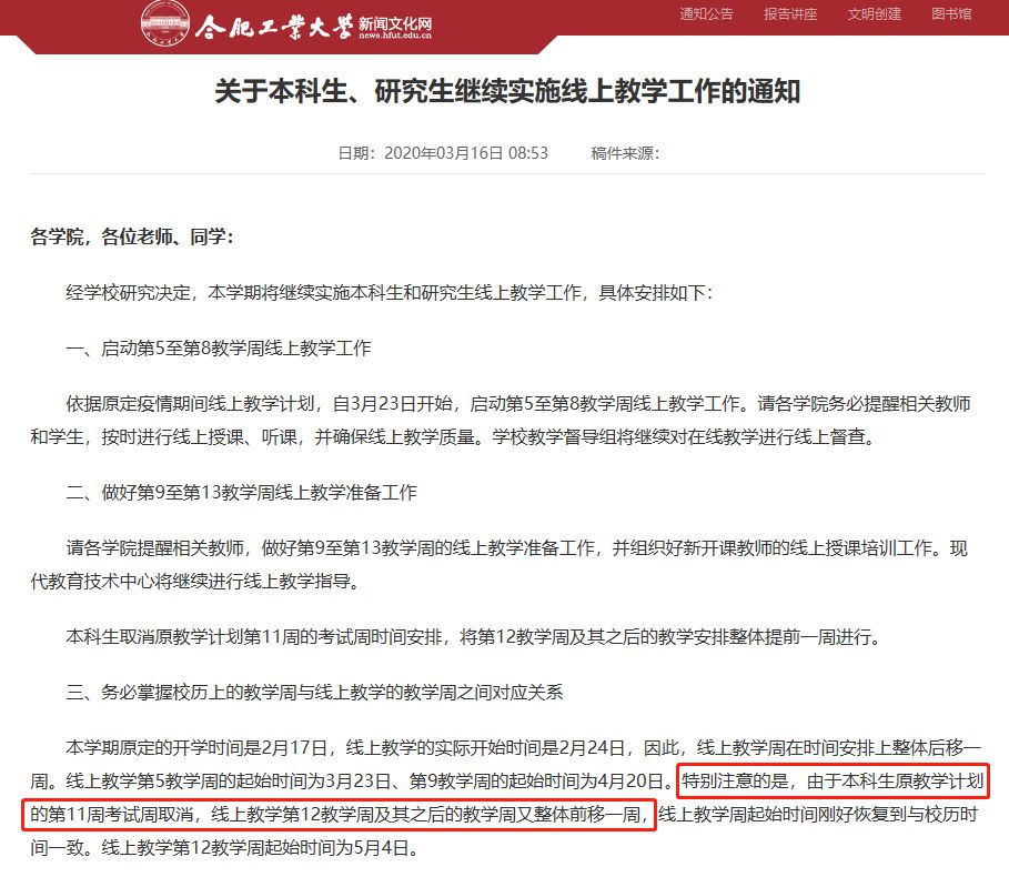 3月16日,合肥工业大学发布了关于本科生、研究生继续实施线上教学工作的通知。