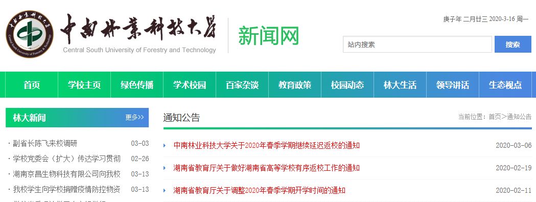 3月16日截稿时中南林业科技大学官网通告栏截图