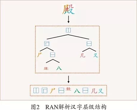 要想更好地解决汉字识别问题,就不能继续将神经网络当成黑盒子,而要充分利用汉字的本质特性,使神经网络的识别过程具备可解释性。文献[1]首次提出基于偏旁部首的汉字识别神经网络(Radical Analysis Network, RAN),充分利用了汉字的特性,见图2。汉字是由偏旁部首通过特有的空间结构构成的。仅用很少的偏旁部首集便能构造出大量的汉字,如约500个偏旁部首便能成功构造出超过25000个汉字。汉字类别很多,拆解成更精简的偏旁部首后,汉字类别数量将大大压缩,去除冗余性。因此,可以很自然地联想到将汉字字符拆解成由偏旁部首构成的层级结构,先识别这种层级结构,再一一对应特定的汉字类别来识别汉字。以“殿”字为例,这个字是左右结构,先是“”字旁和“八”字旁形成上下结构,“尸”字旁左上包围这一上下结构。右边由“几”和“又”上下组成。可以通过深度优先遍历的方式,将层级的树形结构遍历成字符串的形式,再通过识别字符串来识别汉字。有一个预先定义好的结构对应汉字类别的字典。将汉字的结构识别出来之后,在字典里就能索引出结构类别,进而进行汉字识别。这种定制的汉字识别网络具备识别低频汉字的能力,在训练集里没有出现过的词,无须额外收集数据,也不需要重新训练模型。例如,之前很火爆的duang字,上“成”下“龙”形成上下结构。虽然这个字很简单,但是因为训练集中没有,普通的模型无法识别,很有可能将其识别成“成”“龙”或其他字。RAN模型可以在集外字场景下将其识别出来,以duang字作为输入,解出“成”和“龙”,同时出现一个表示“成”和“龙”上下结构的序列。