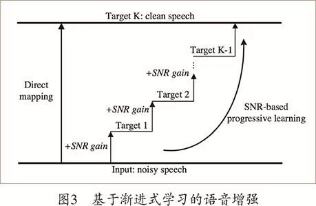 针对训练难题,文献[4, 5]提出渐进式语音增强(SNR-based progressive learning),如图3右侧所示。其基本思想是从“小”开始,先学习容易的任务或子任务,然后逐渐增加学习难度。具体到语音增强任务,带噪语音到干净语音的映射按照信噪比(SNR)递增的方式被分解为多个子问题,每一个子问题被定义为提升输入语音的信噪比(SNR gain)。前一个问题的输出视为下一个问题的输入,每一步问题的求解都会使得下一步的难度降低。渐进式学习可以使得网络内部功能明确而有序,逐层递进,直达最终学习目标。以输入带噪语音的信噪比是0dB为例,对于直接映射来说,其学习目标是对应的干净语音;对于渐进式语音增强来说,除了干净语音是最终的学习目标之外,还存在多个中间目标,这些中间目标是信噪比更高的带噪语音,如10dB、20dB等。