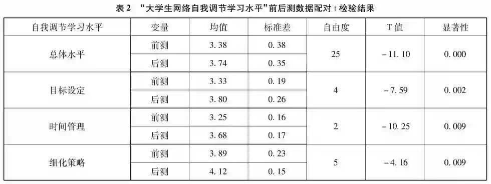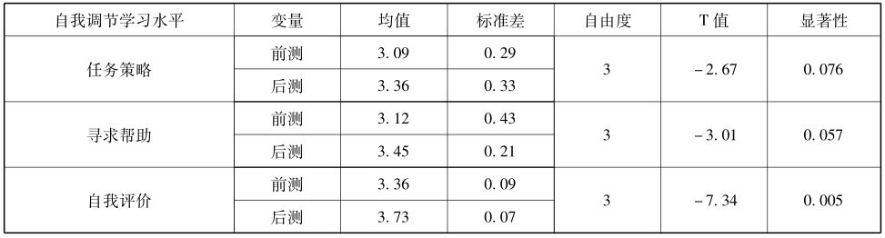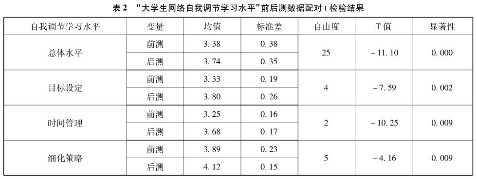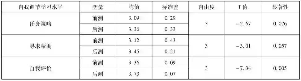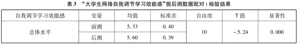 本研究采用SESRLS量表测量实验前后大学生的网络学习自我调节学习效能感,并将前后测数据进行配对t检验,以分析干预策略对培养大学生网络自我调节学习效能感的效果。数据分析结果如表3所示,干预策略实施前后测的大学生网络自我调节学习效能感数据在小于0.01的水平上发生显著性差异,验证了在网络学习社区相关技术支持下成功问题解决的体验、基于学习共同体的相互鼓励、数据支持的反思与归因等网络自我调节学效能感提升策略的有效性。