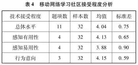 技术接受度调查量表的统计结果如表4所示,学生对移动网络学习社区总体接受程度较高(M=4.04,Std=0.75);大多数学生认为该技术环境能够引导其积极地自我调节学习并辅助其完成学习任务(M=4.13,Std=0.65);由于未将在线协作绘图平台、即时通讯与社区平台整合在一起,使用起来会有一些冗余步骤,导致感知易用性得分不高(M=3.88,Std=0.90);多数学生仍表示在未来的学习过程中愿意积极使用该环境辅助其完成学习任务(M=4.15,Std=0.59),且认为可推广性较强。