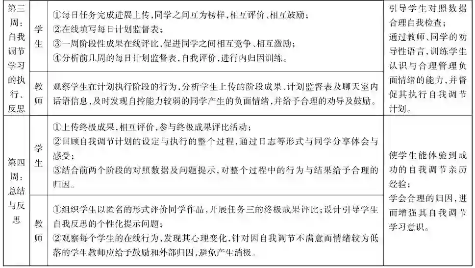 网络技术的发展使高效率的在线探究式学习、协作学习成为可能,同时师生之间的时空分离以及网络中的无限“诱惑”给有意义的网络学习设计带来了更多的挑战。例如,通过网络搜索引擎我们可以随时在网络中获得自己需要的知识,但一个即时信息提示框也可能把我们带到其他的网络空间。因此,在网络学习设计方面,充分利用计算机辅助学习系统及技术设计相应的支架,有效引导学生进行自我调节学习,以及培养学生在网络学习过程中自我监督、自我控制及自我管理能力显得尤为重要。网络技术环境下自我调节学习引导与干预的核心目的应是在自我调节学习行为干预的过程中,提升学习者在网络学习环境下自我调节学习、完成学习任务的效率,即培养学生在网络学习情境下的自我调节学习效能感。