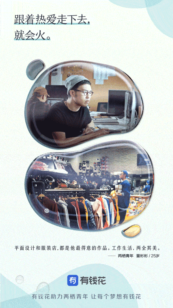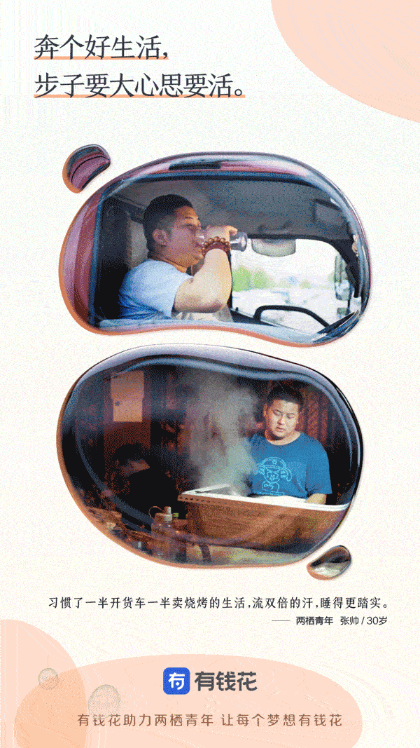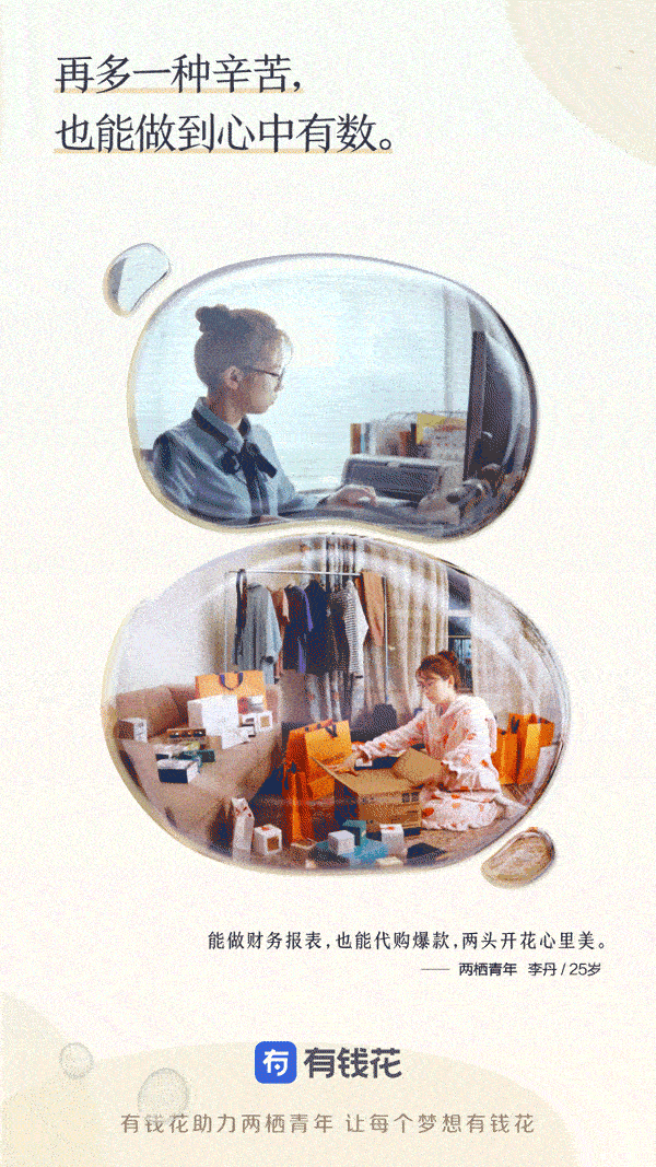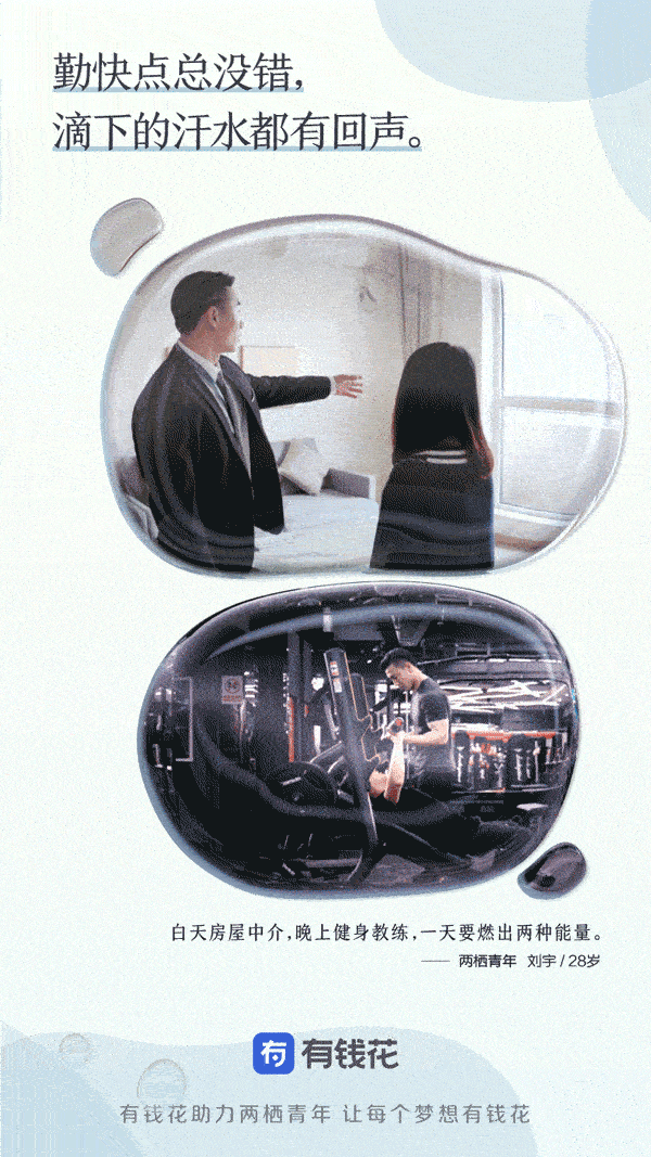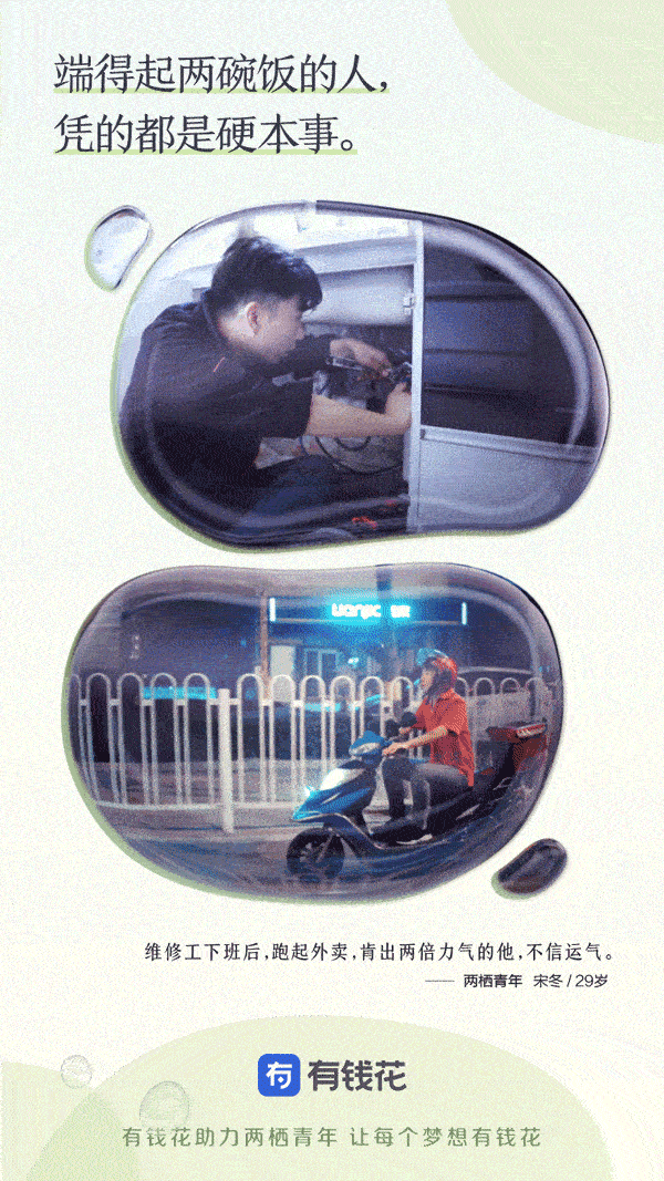 这些白天努力干着苦活累活,晚上仍努力发展副业的年轻人,才是当代社会中自强不息、有奋斗精神和抱负的有为青年,与职业无关,与心态和行动有关。以“让每个梦想有钱花”作为品牌理念的信贷服务产品有钱花,就是希望开业助力这些年轻人实现自己的梦想。时值五四运动100周年,这群努力打拼的“两栖青年”,正是延续了这种中国青年永久奋斗的好传统。