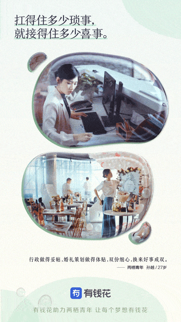 刘宇通过努力工作攒下的一小笔钱,借助“有钱花”筹备创业资金,成功地开创了自己的新事业,并一步步地离自己买房的目标越来越近。这正符合有钱花的品牌理念,“让每个梦想有钱花”,服务两栖青年们,让他们能够平衡现实和梦想。