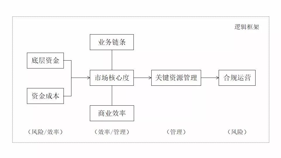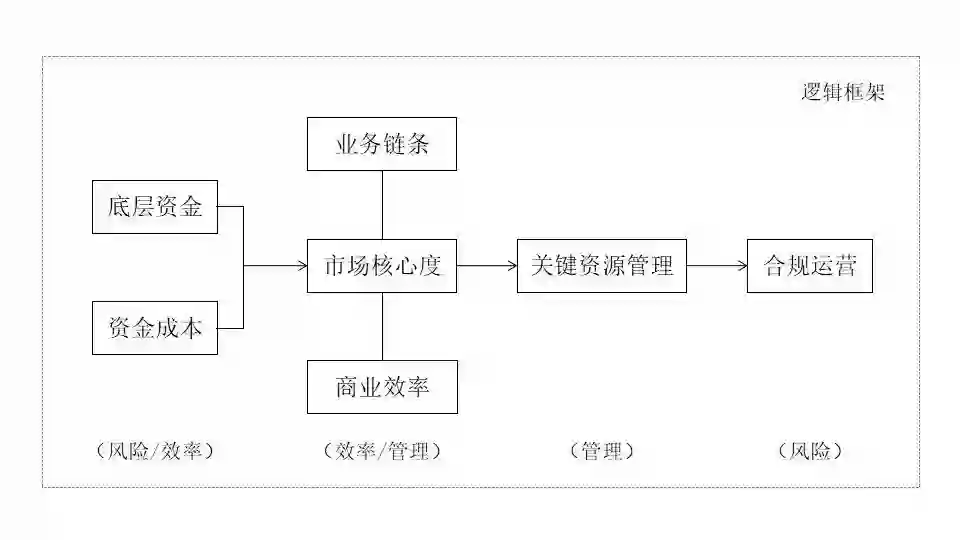 综上所述,我们目前大多是从与资金方合作方式、监管合规、金融科技与风控模式等角度分析助贷机构。但是在我看来,以上的分析方法仅仅是停留在表象当中,仍然不能找到造成例如超利贷、套路贷等违规问题核心原因。我认为助贷机构需要撮合资金供给方与资金需求方,其定位不仅是局限于资金方的辅助位置,同时助贷也是借贷双方的组织者,所以我们需要一个全新的以助贷机构为主体的分析视角,同时还需要穿透包括运营合规、绩利润迅猛增长以及金融科技创新这些华丽外衣,才能探索到更深层的助贷产业的内在逻辑结构。这就需要一个区别于以往传统的分析方法,在此我提出了一套全新的理论框架,从底层资金、资金成本、业务链条、市场核心度、商业效率、关键资源管理、合规运营七个方面来透视助贷业务的本质。