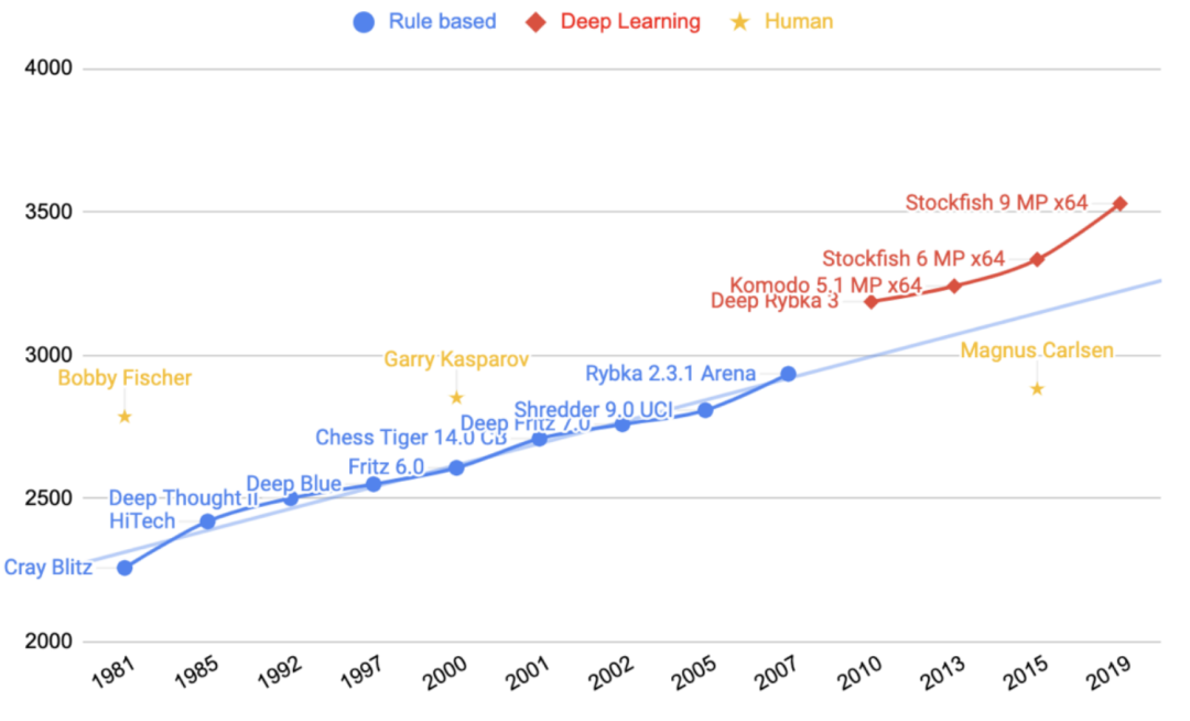 Elo 评分系统是大家普遍接受的衡量国际象棋表现的方法,它可以有效比较大家的棋艺水平。下图是世界冠军和国际象棋游戏引擎的评分。在过去的50年里,人类的表现一直徘徊在 2800 分,但在 2010 年被计算机超越。