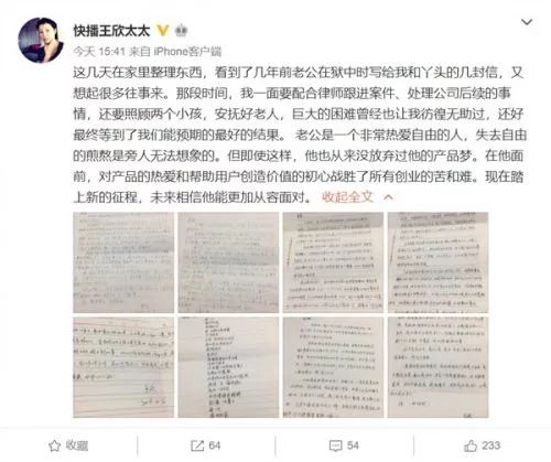 彭鹏感慨道:“这几天在家里整理东西,看到了几年前老公在狱中时写给我和丫头的几封信,又想起很多往事来。那段时间,我一面要配合律师跟进案件、处理公司后续的事情,还要照顾两个小孩,安抚好老人,巨大的困难曾经也让我彷徨无助过,还好最终等到了我们能预期的最好的结果。老公是一个非常热爱自由的人,失去自由的煎熬是旁人无法想象的。但即使这样,他也从来没放弃过他的产品梦。在他面前,对产品的热爱和帮助用户创造价值的初心战胜了所有创业的苦和难。现在踏上新的征程,未来相信他能更加从容面对。”