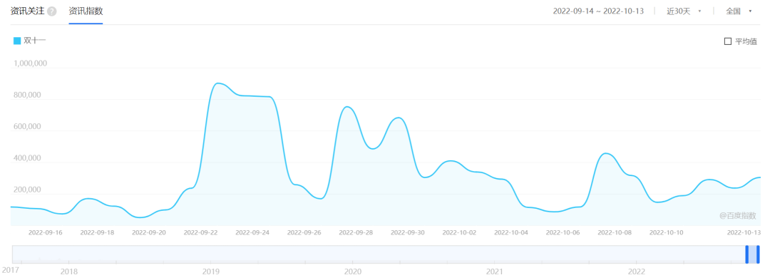 用户的态度也在变得更加冷淡。百度搜索指数显示,截止发稿时,天猫双十一热度的高点出现在10月13日,但同比只微微增长6%,1174的日均值和去年同期相比几无变化。百度资讯指数则显示,今年双十一第一波热度出现在9月底公布招商规则的时候。随着用户和媒体的热情被迅速耗尽,10月公布满减规则时该指数并未见明显上升,后劲明显不足,在往年双11这样的曲线根本就难以想象。