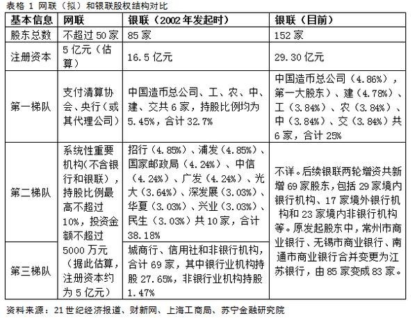 为了防止网联平台被大型支付机构垄断,网联在股权结构的设计上,央行系成为第一大股东,央行下属6家单位(央行清算总中心、上海清算所、黄金交易所等)将共出资约7亿元,占股比例超过30%,以保证央行对网联平台的控制权和投票否决权;支付巨头支付宝和财付通分别持股约10%左右;中国清算支付协会持股比例为3%,代表不符合入股资格的中小支付机构行使投票权。