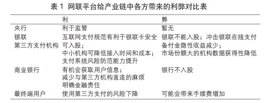 在此之前,支付机构和银行之间的费用由多家第三方支付机构和多家银行分别拟定,多方关系比较紊乱。网联建成后,第三方支付公司和银行面临的都由“n”变“1”,所有的接口都通向网联,网联接口同一价钱,可避免业内话语权影响公允竞争;也有助于使资金流向一目了然,有利于监管。