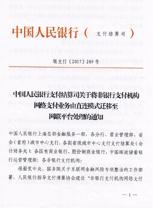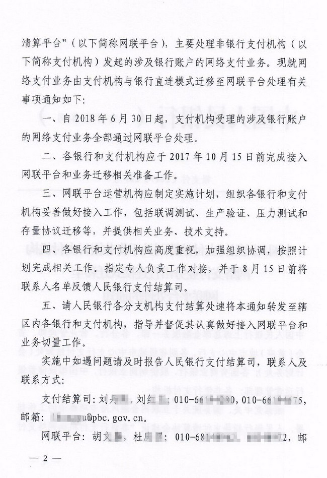 一、自2018年6月30日起,支付机构受理的涉及银行账户的网络支付业务全部通过网联平台处理。