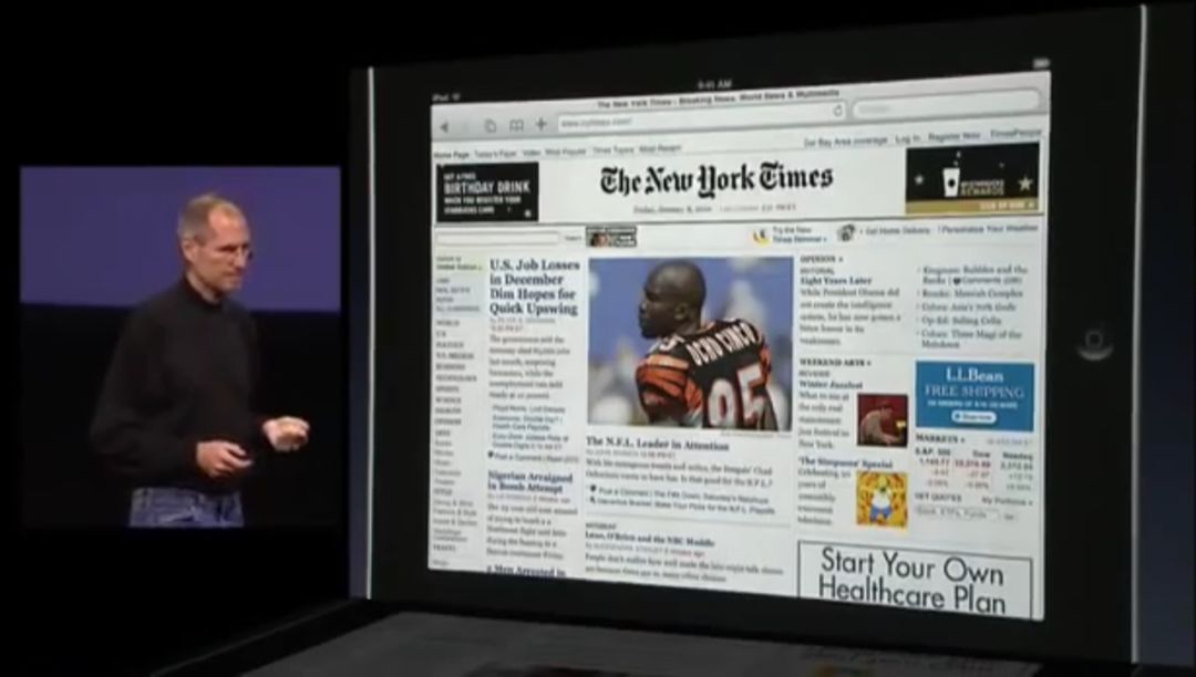 2010 年1 月27 日,在旧金山芳草地艺术中心,主题为“Come See Our Latest Creation.”苹果发布会,初代iPad 向世界展示了全新的大尺寸移动电子设备类别,作为一款「Tablet」它的定位在iPhone 与MacBook 之间。