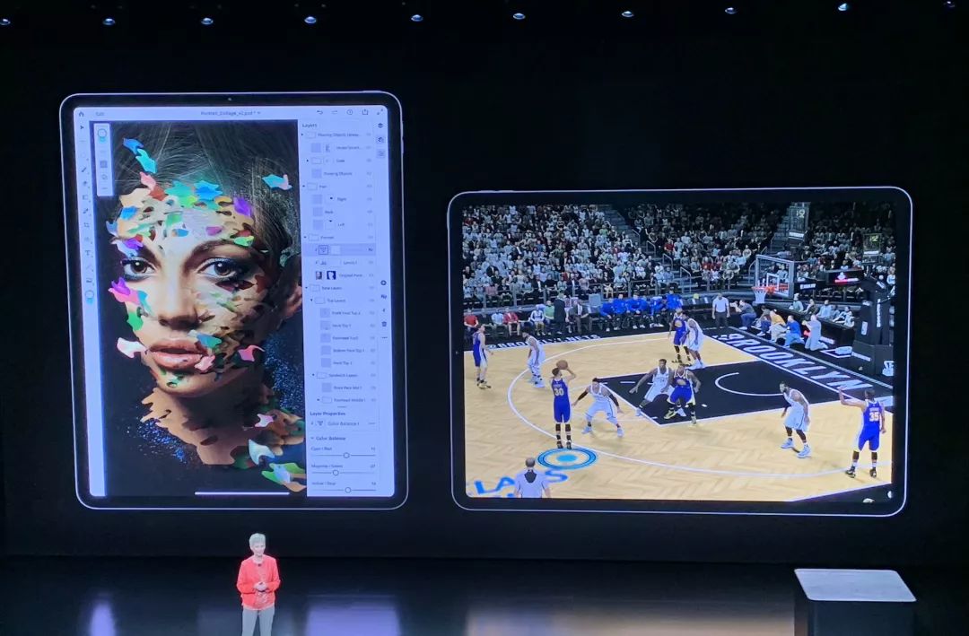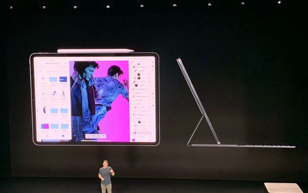 发布会Keynote 演示环节,我们可以看到全面屏iPad Pro 在软件生态建设方面的一些动作。2K 带来桌面级渲染NBA 大作,这与目前你在iPhone 上玩的完全是两个游戏,细腻程度可能更接近PS4 上的体验。Adobe 推出全功能PhotoShop,现场打开高达3 个G 的PSD 文件,叠加了超过100 个图层。