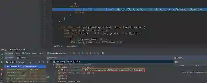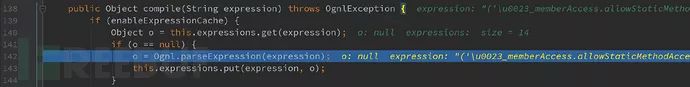 跟进parseExpression,这里从topLevelExpression开始对语法书进行解析,进入到ognl-2.7.3.jar!ognl/OgnlParser中的expression()进行解析,可以看到,最后将结果保存到值栈中,\u0023被解析成#