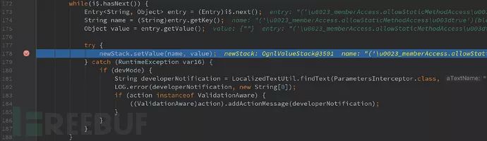 和S2-003大体相同,在xwork-core-2.1.16.jar!com/opensymphony/xwork2/interceptor/ParametersInterceptor中断点调试