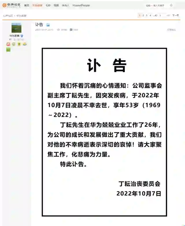 10 月 7 日晚间消息,华为公司监事会副主席丁耘因突发疾病去世,华为方面发布讣告表示,“我们怀着沉痛的心情通知,丁耘因突发疾病,于2022 年 10 月 7日凌晨不幸去世,享年 53 岁(1969 ~2022)。”