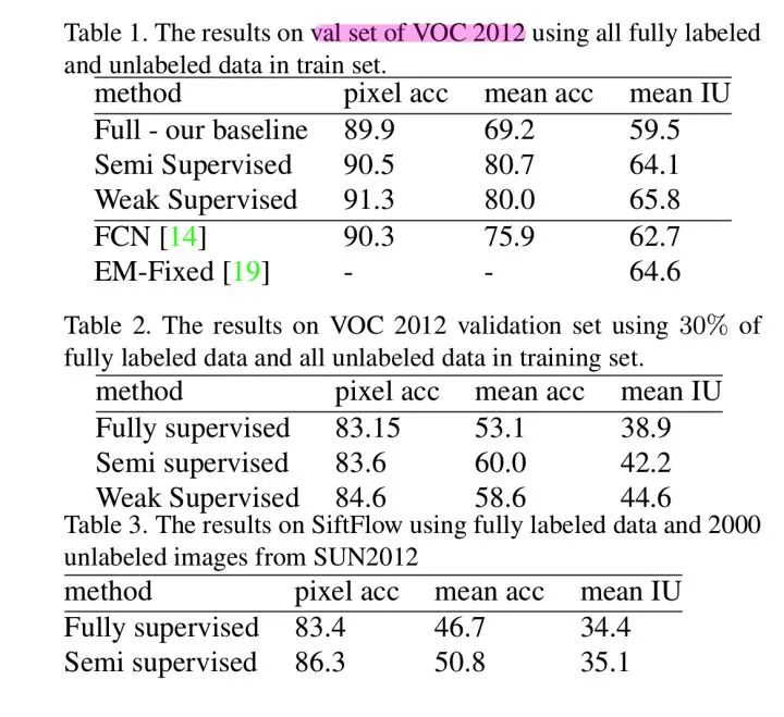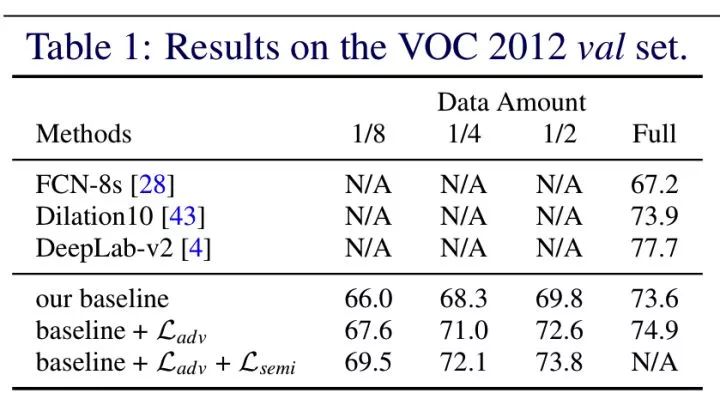 在 VOC 上的实验,使用 1.4K 的强标签,其它将近 10K 张图作为未标记数据,以及 Generator 产生的假数据进行训练。Discriminator 作为分割网络则多了一类 Fake。对于未标记的数据,Discriminator 要压低 Fake 类的置信度;对于 Generator 产生的假数据,要提高 Fake 类的置信度;强标签的数据正常训练就行。