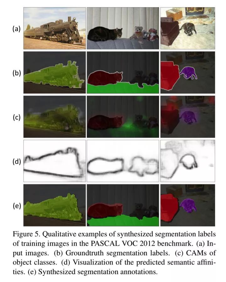 本论文仅使用 Label 级的图片标注,利用CAM(class activation map)作为基础,辅助以提出的 AffinityNet 得到 mask 标签,最后以此训练分割模型。