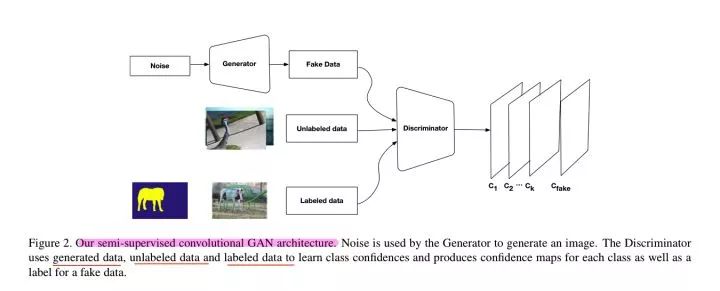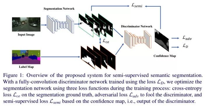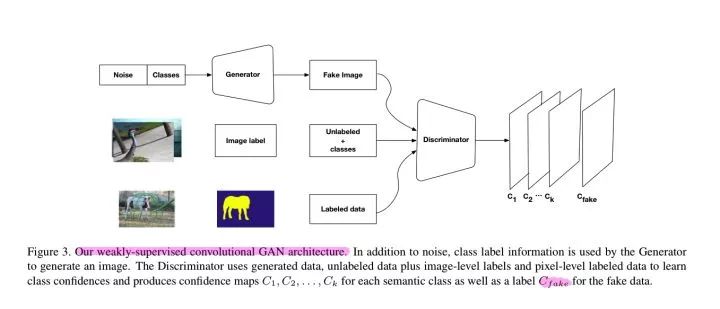 该论文对 GAN 在语义分割上的使用和以往有所不同,分割网络没有作为 Generator 而是 Discriminator。并且提出了 semi-supervised 训练以及 weakly-supervised 训练的框架:
