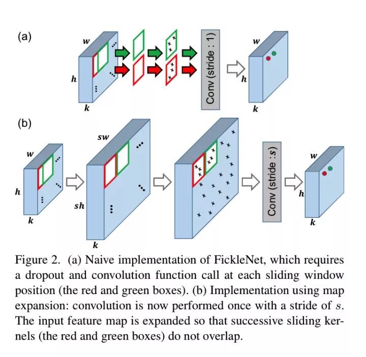 然后,我们使用保留中心的dropout技术来选择x^expand上的隐藏单元。虽然扩展后的特征图需要更多的GPU内存,但是需要训练的参数数量保持不变(因为还是那些卷积权重, 只是跨步大了些),GPU的负载没有明显增加,
