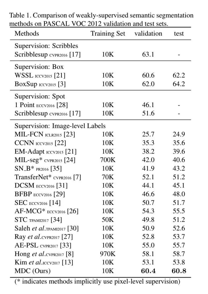 此论文也是使用 CAM 作为起点,使用辅助模型 MDC (multiple dilated convolutional)来对无标注的数据进行标注,以此来训练分割模型。
