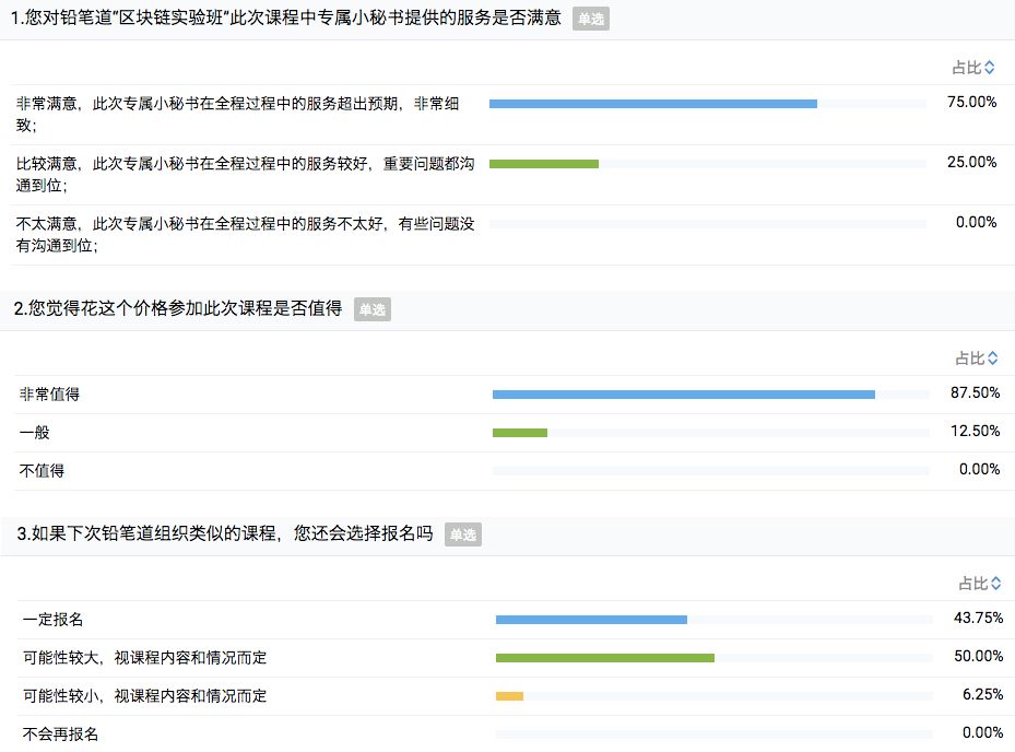 课后,我们做了一次小调研。从反馈来看,100%的学员事后表示课程值得上,其中约87%认为非常值得。100%的学员为秘书们的服务勾选了满意和非常满意。约94%的同学愿意再次报名,其中约44%表示一定报名。