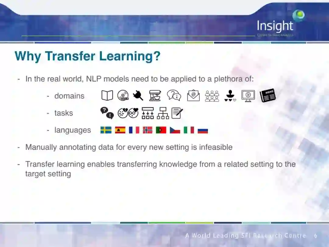 现实中的自然语言处理面临着多领域、多语种上的多种类型的任务,为每个任务都单独进行数据标注是不大可行的,而迁移学习可以将学习的知识迁移到相关的场景下