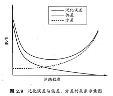 这其中,训练程度是可以通过调参,增加特征进行控制的。 训练程度不足时,模型的拟合程度不够,偏差较大,训练数据的变化不会导致结果出现显著的变化,这时偏差主导了泛化误差率,随着训练程度加深,模型拟合程度加大,偏差逐渐减小,但此时对于数据的依赖性变强,数据的任一微小变动都可能导致结果发生巨大变化,可能出现过拟合现象。此时,方差主导的泛化误差率。