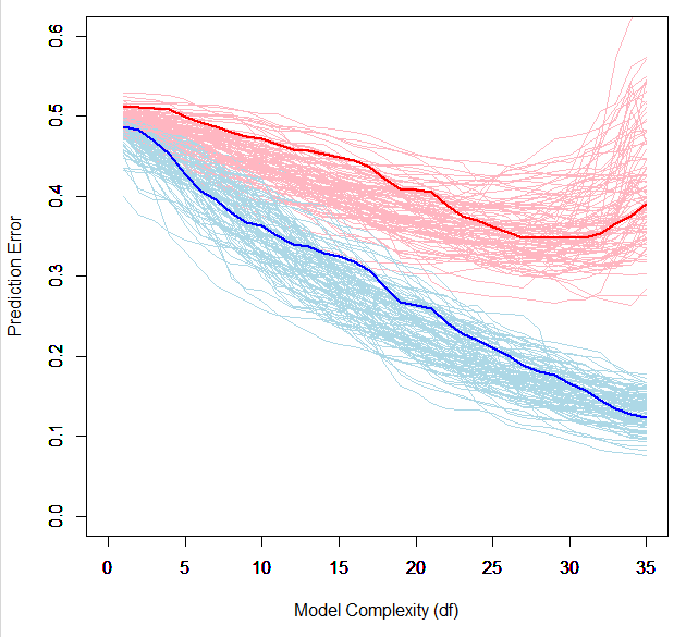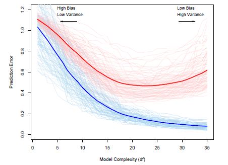 首先解释下这个图,图中浅红色线为用来自同一分布的不同训练集训练的模型对同一测试集预测结果的误差,浅蓝色线为对用于训练的训练集预测结果的误差,浅红色线和浅蓝色线分别是100条,即有100个训练集。深红色和深蓝色线为浅色线的平均,用均值作为期望的估计量。