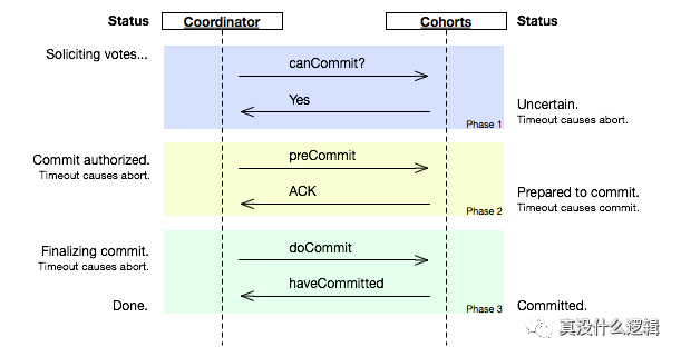当参与者向协调者发送 ACK 后,如果长时间没有得到协调者的响应,在默认情况下,参与者会自动将超时的事务进行提交,不会像两阶段提交中被阻塞住;上述的图片非常清楚地说明了在不同阶段,协调者或者参与者的超时会造成什么样的行为。