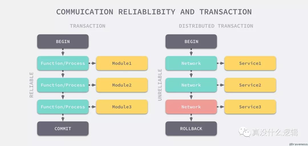 从广义上来看,分布式事务其实也是事务,只是由于业务上的定义以及微服务架构设计的问题,所以需要在多个服务之间保证业务的事务性,也就是 ACID 四个特性;从单机的数据库事务变成分布式事务时,原有单机中相对可靠的方法调用以及进程间通信方式已经没有办法使用,同时由于网络通信经常是不稳定的,所以服务之间信息的传递会出现障碍。