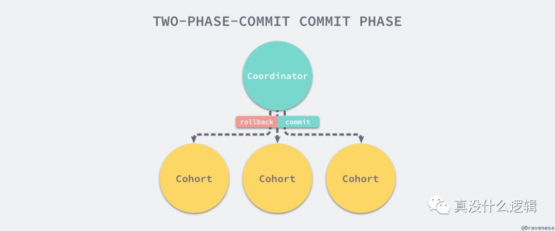当事务的所有参与者都决定提交事务时,协调者会向参与者发送 COMMIT 请求,参与者在完成操作并释放资源之后向协调者返回完成消息,协调者在收到所有参与者的完成消息时会结束整个事务;与之相反,当有参与者决定 ABORT 当前事务时,协调者会向事务的参与者发送回滚请求,参与者会根据之前执行操作时的回滚日志对操作进行回滚并向协调者发送完成的消息,在提交阶段,无论当前事务被提交还是回滚,所有的资源都会被释放并且事务也一定会结束。